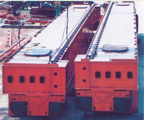 橋架在高架軌道上運行的一種橋架型起重機,又稱天車。橋式起重機的橋架沿鋪設在兩側(cè)高架上的軌道縱向運行,起重小車沿鋪設在橋架上的軌道橫向運行,構成一矩形的工作范圍,就可以充分利用橋架下面的空間吊運物料,不受地面設備的阻礙。這種起重機廣泛用在室內(nèi)外倉庫、廠房、碼頭和露天貯料場等處。